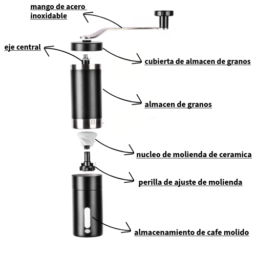 Nuestro molino manual de acero tiene una perilla ajustable en su nucleo de ceramica la cual permite que elijas la molienda deseada y asi poder darle el sabor justo a tu cafe.